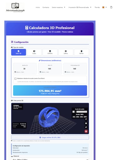 Nuestra Calculadora de Costes de Impresión 3D te permite subir tus propios archivos 3D (.STL, .OBJ o .3MF) de forma rápida y sencilla. Puedes escalar tu modelo al tamaño exacto que necesites y obtener al instante un coste total aproximado para la impresión de tu pieza en 3D.